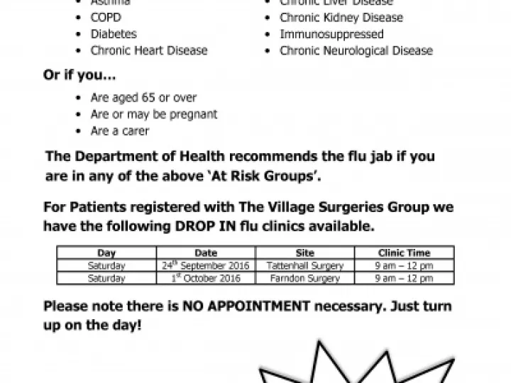 'Drop In' Flu Clinic in Farndon – 1 October 2016.